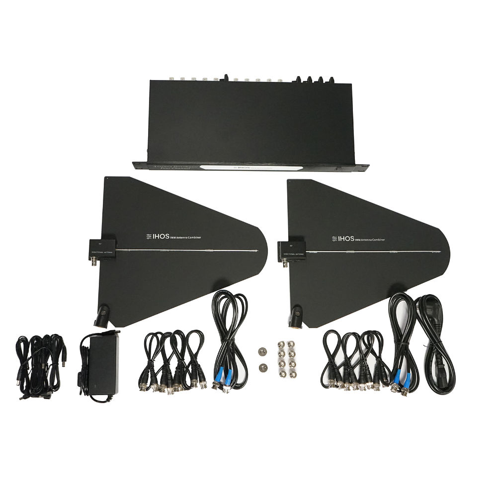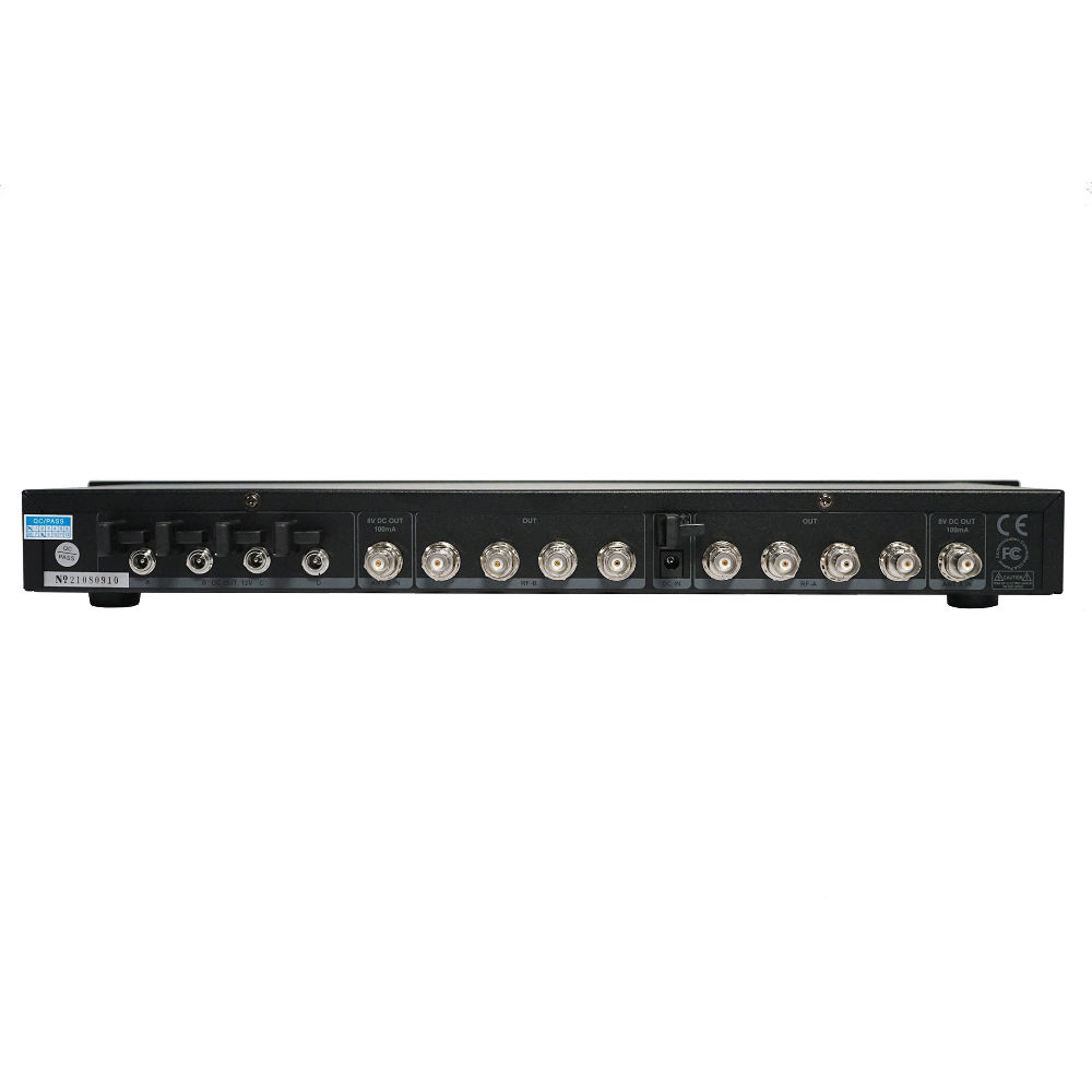 Microfones sem fio Dispositivo distribuidor de antena de 4 canais, frequência de operação 500Mhz-999Mhz, antenas LPDA, ganho máximo de 10dB, tensão de trabalho 8VDC.